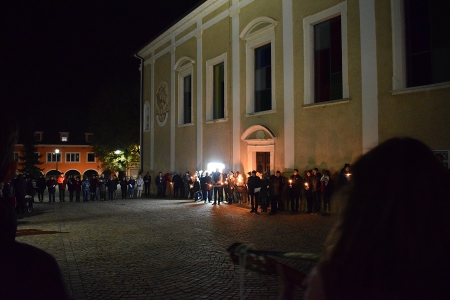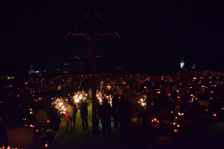 Am 1. November war es um 19 Uhr wieder so weit. Alle anwesenden Pfarrbewohner hatten Kerzen oder Laternen in der Hand. Unsere Chorleiterin hatte auch schon ihre Gitarre in der Hand und unser Kaplan war auch so weit. Und schon ging es los...ein steiler Aufstieg zum Friedhof.