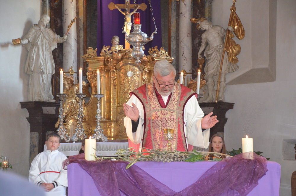 Pfarrer Dr. Hüttl segnete die mitgebrachten Palmzweige, bestehend aus Weidenkätzchen, und hatte auch einige echte Ölzweige dabei. Die freiwilligen Spenden dafür kommen Christinnen und Christen in Palästina zugute, die aktuell unter schweren, unmenschlichen Bedingungen leben müssen.