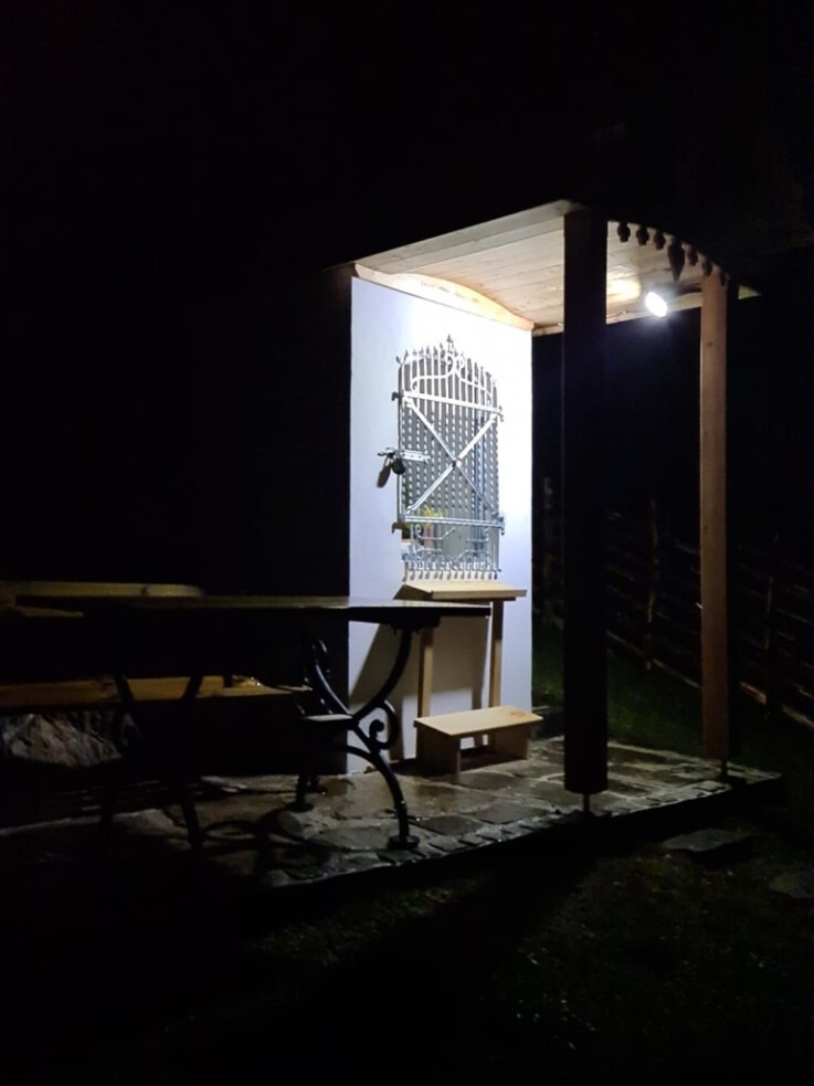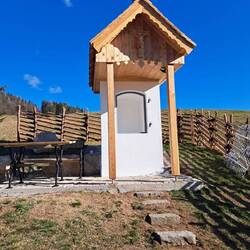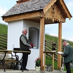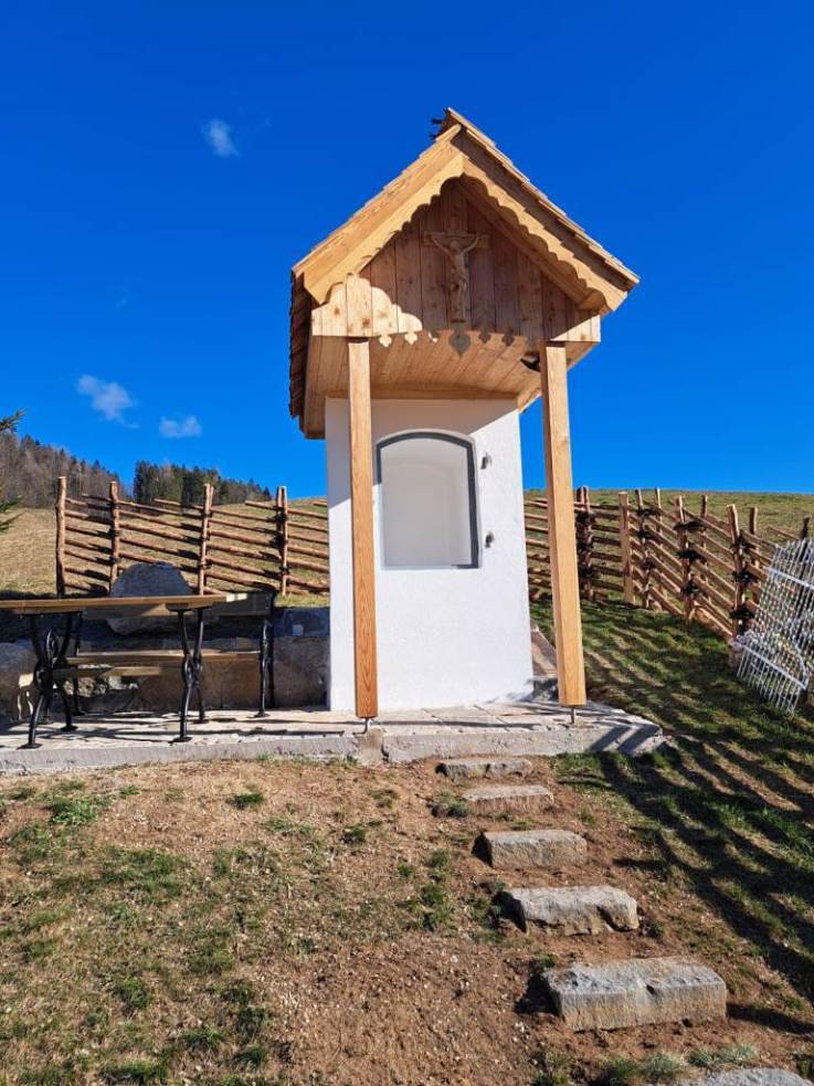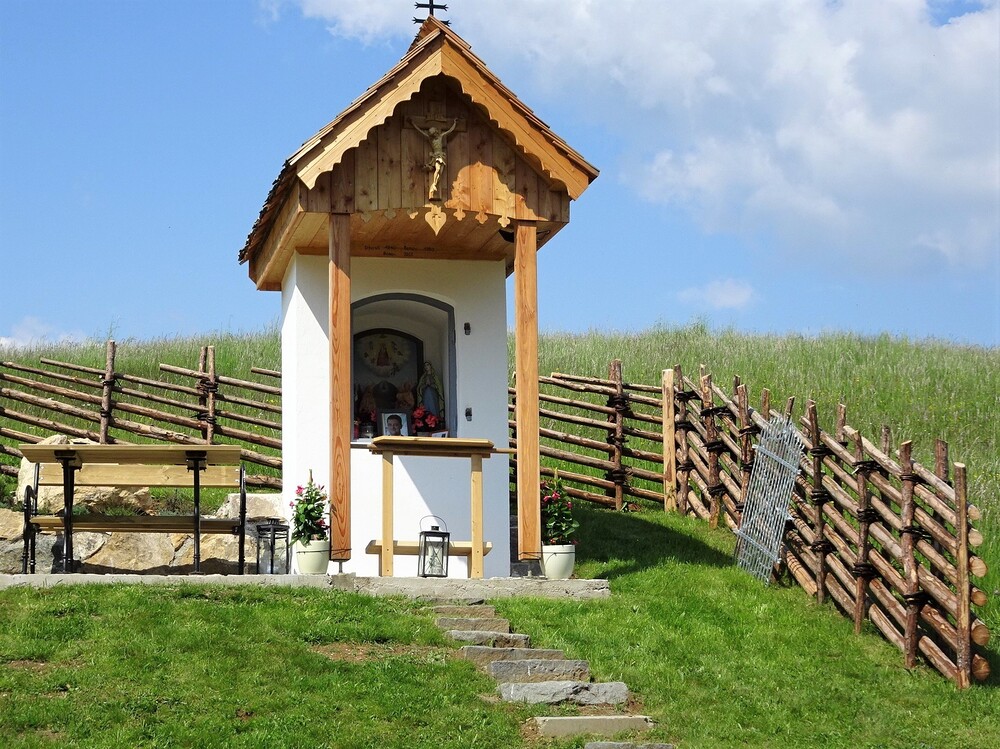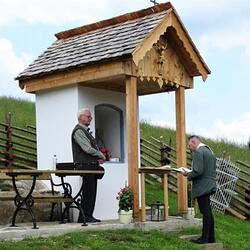 Das morsche Holzvordach wurde durch eine gefällige Lärchenholzstruktur ersetzt. Das Dach wurde mit neuen Holzschindeln gedeckt und das Wetterkreuz wiederum am First befestigt. Ein einzigartiges Novum ist die Installierung einer Solarbeleuchtung für die Nacht.