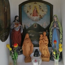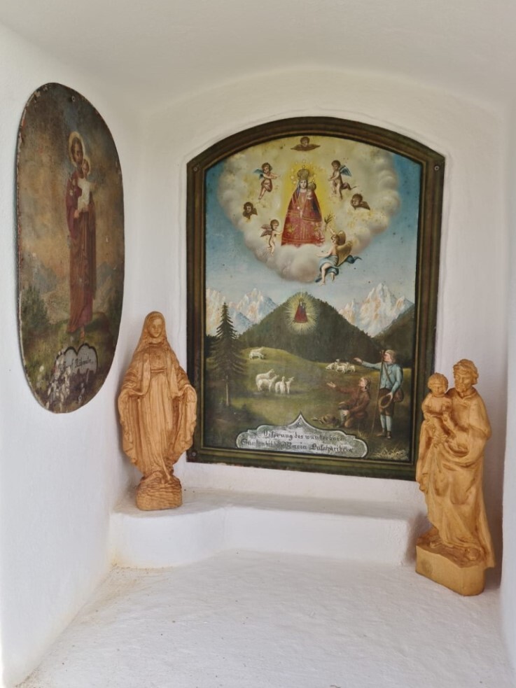 In der zentralen Mauernische befindet sich neben dem Gnadenbild Maria Luschariberg, flankiert von wertvollen Maria- und Jesus-Statuen, neuerdings auch zwei Heiligenstatuen aus Lindenholz, hergestellt vom
