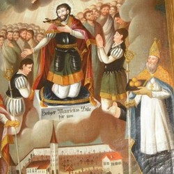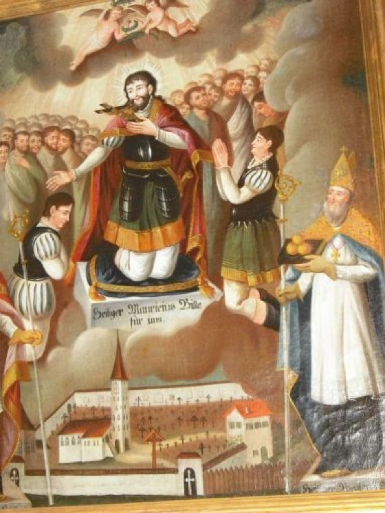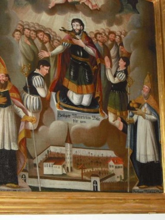Der heilige Mauritius war der Überlieferung nach ein römischer Offizier, der wie alle anderen Mitglieder seiner in Agaunum (heute St. Moritz in der Schweiz) stationierten Legion aus Theben in Ägypten stammte und Christ war. Die Legion weigerte sich, den römischen Göttern zu opfern und an Christenverfolgungen teilzunehmen. Daraufhin ließ ein Mitregent von Kaiser Diokletian zur Abschreckung jeden 10. Mann umbringen. Die christliche Legion zeigte sich jedoch von dieser drakonischen Maßnahme unbeeindruckt. Anfang des 3. Jahrhunderts starb dann Mauritius den Märtyrertod. Auf Veranlassung des deutschen Kaisers Otto I. bestätigte Papst Johannes XII im Jahr 962 die Verehrung des Heiligen, dessen Gedenktag nun am 22. September gefeiert wird. Der Name „Mauritius“ ist eine Weiterbildung von lateinisch „Maurus“, das heißt „der aus Mauretanien Stammende“ bzw. „der Mohr“. Der heilige Mauritius wird daher immer als dunkelhäutiger Soldat dargestellt wie im Bildstock vor der Murbrücke. Er ist unter anderem der Patron der Soldaten, Schmiede und Glasmaler, hilft bei Pferdekrankheiten, Gicht und Ohrenleiden.