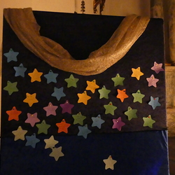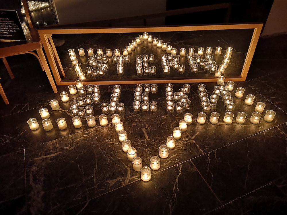 Viele, aus Kerzenlichtern gestellte Figuren konnten bestaunt werden: ein Engel, ein Kelch, ein buntes Kirchenfenster, Sterne in allen Varianten, ein schön beleuchteter Altarraum mit einem Engel und der Engel des Herrn in verschiedenen Sprachen, ein Sternenhimmel und vieles mehr. Als Besucher konnte man sich auch aktiv beschäftigen – einen Leuchtstein in den Himmel legen und ein Sterngedicht mit nach Hause nehmen.